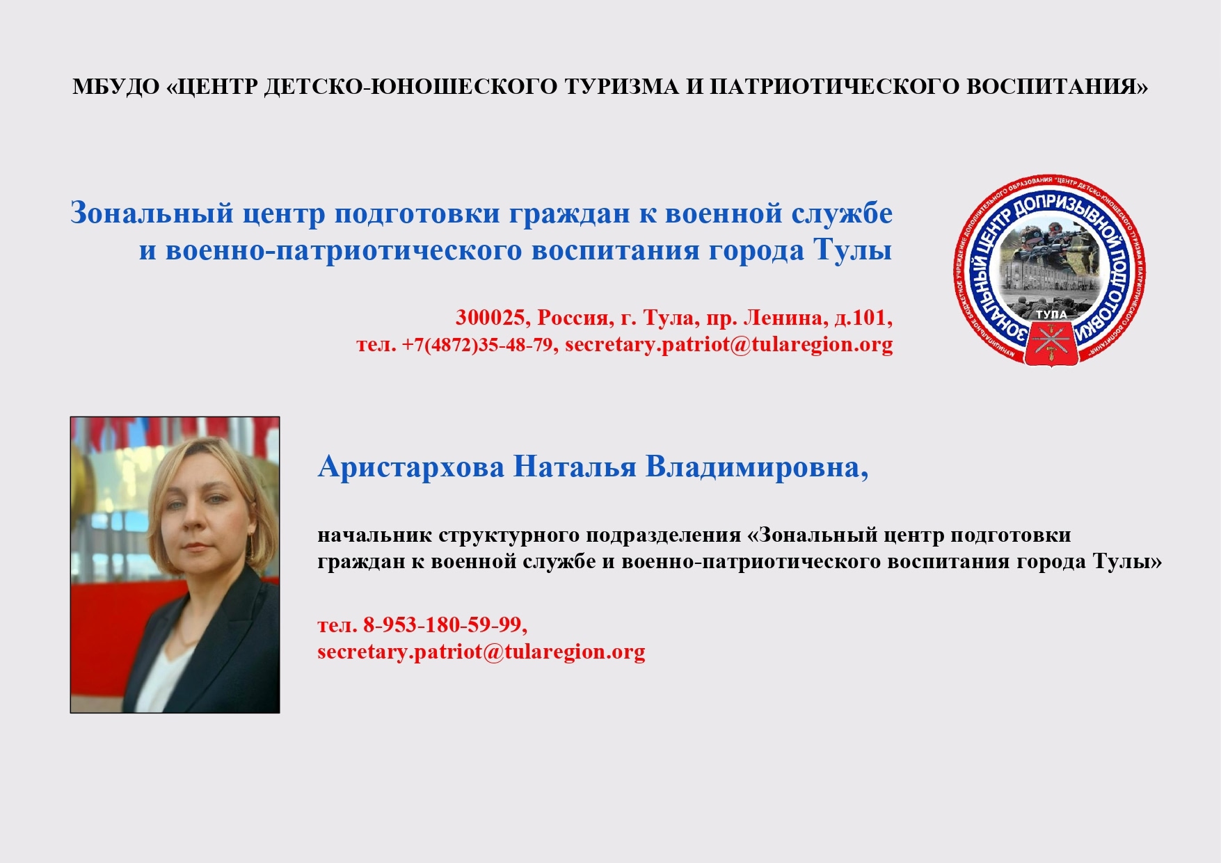 Адрес: 300041, г. Тула, ул. Дзержинского/ул. Советская, д. 15-17/73 Тел.: (4872) 30-48-57 E-mail: cnppm_tula@tularegion.org